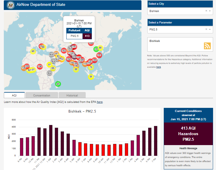 Информация обновляется каждый час. На 19.00 индекс качества воздуха в районе дипломатической миссии — 413 (AQI).