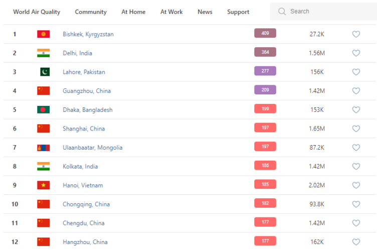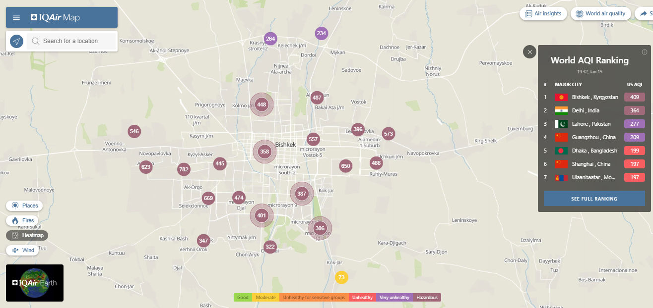В рейтинге крупнейших городов мира по качеству воздуха World Air Quality Бишкек остается на первом месте.