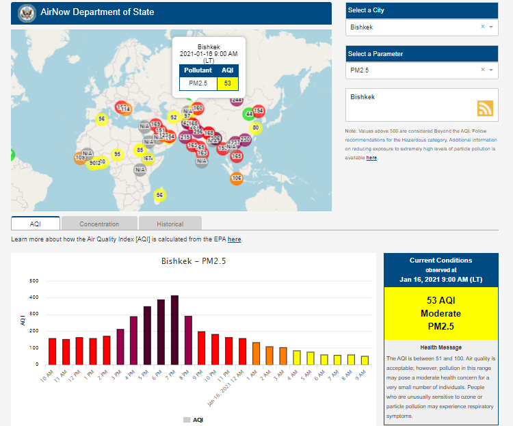 Информация обновляется каждый час. На 9.00 индекс качества воздуха в районе дипломатической миссии — 53 (AQI).