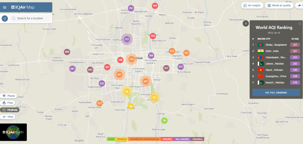 В рейтинге крупнейших городов мира по качеству воздуха World Air Quality Бишкек опустился на 21-е место.