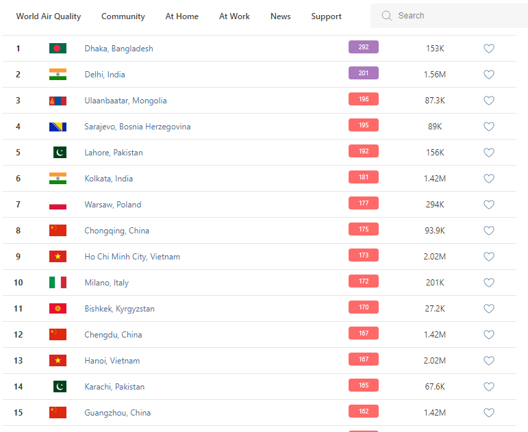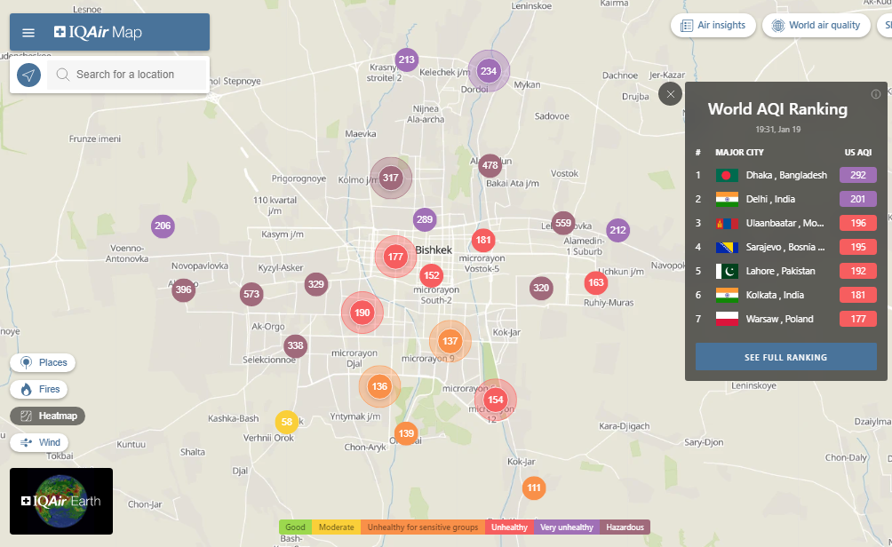 В рейтинге крупнейших городов мира по качеству воздуха World Air Quality Бишкек поднялся на 11-е место.