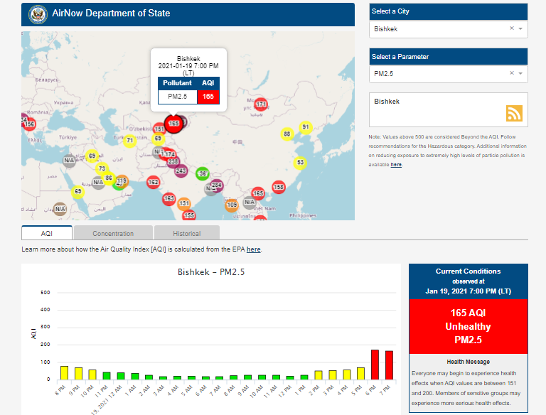 Информация обновляется каждый час. На 19.00 индекс качества воздуха в районе дипломатической миссии — 165 (AQI).