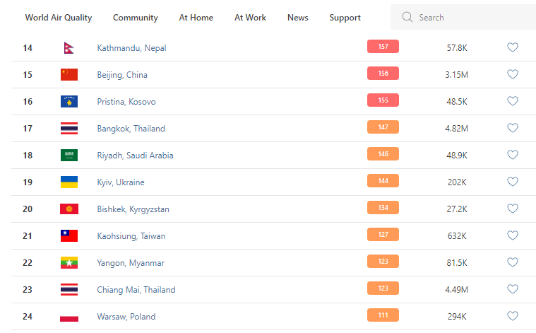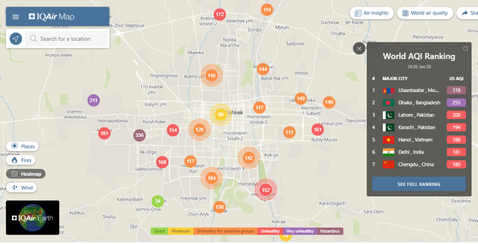 В рейтинге крупнейших городов мира по качеству воздуха World Air Quality Бишкек поднялся на 20-е место.