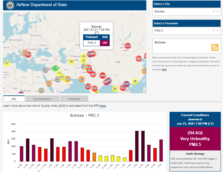 В 19.30 статус города отмечен как «Очень нездоровый» (Very Unhealthy). Индекс качества воздуха, по данным сайта, составляет 207 (AQI).