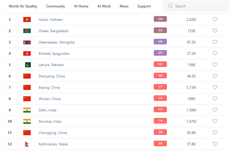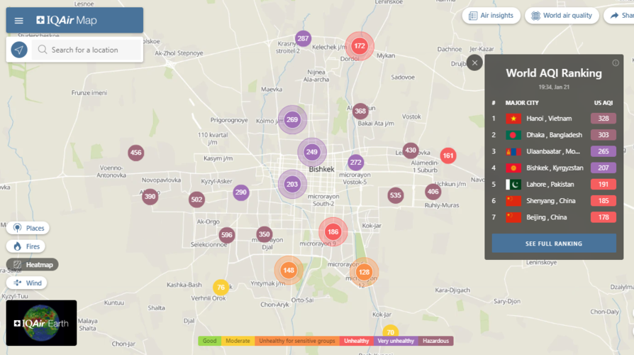 В рейтинге крупнейших городов мира по качеству воздуха World Air Quality Бишкек поднялся на четвертое место.
