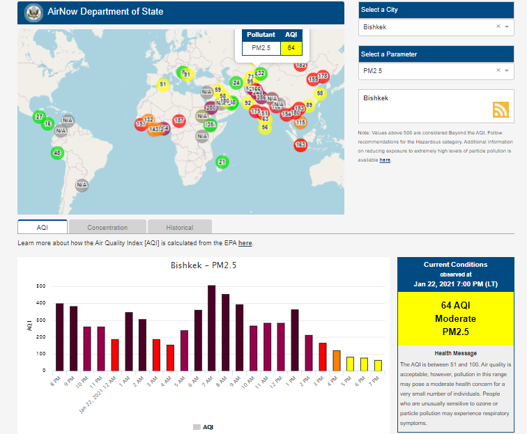 Информация обновляется каждый час. На 19.00 индекс качества воздуха в районе дипломатической миссии — 64 (AQI).