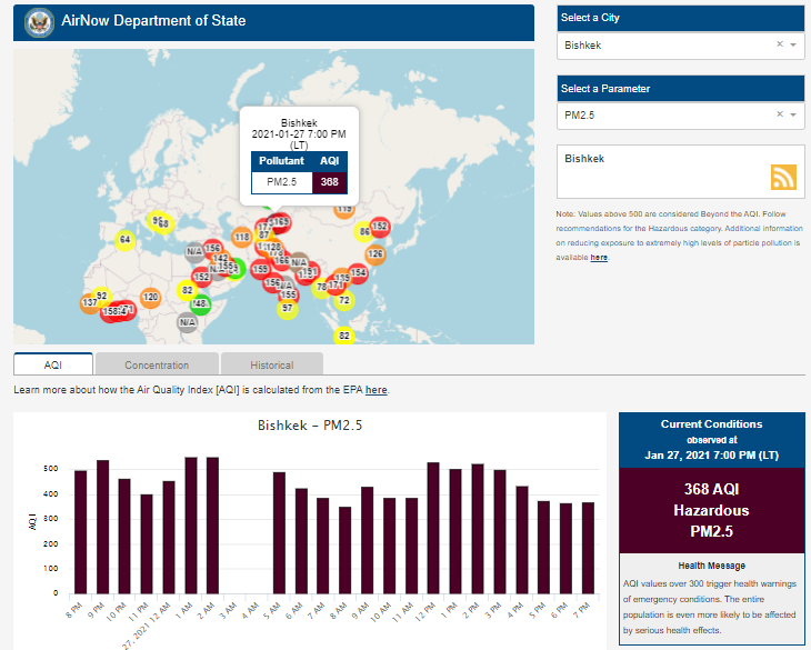 В 19.30 статус города отмечен как «опасный» (hazardous). Индекс качества воздуха, по данным сайта, составляет 413 (AQI).
