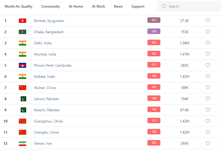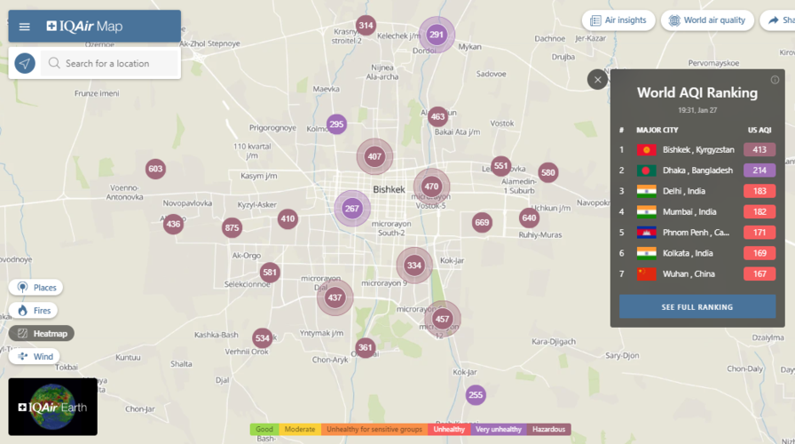 В рейтинге крупнейших городов мира по качеству воздуха World Air Quality Бишкек находится на первом месте.