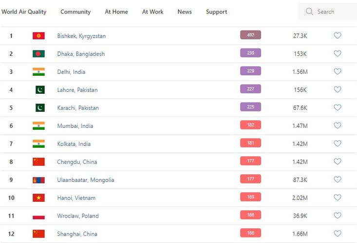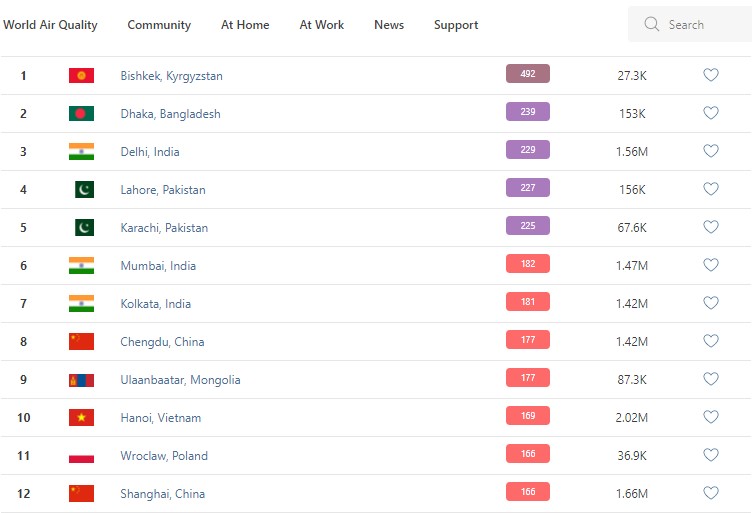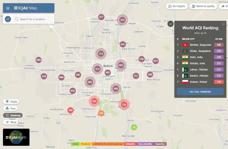 В рейтинге крупнейших городов мира по качеству воздуха World Air Quality Бишкек находится на первом месте.