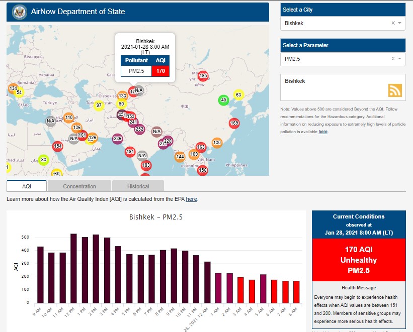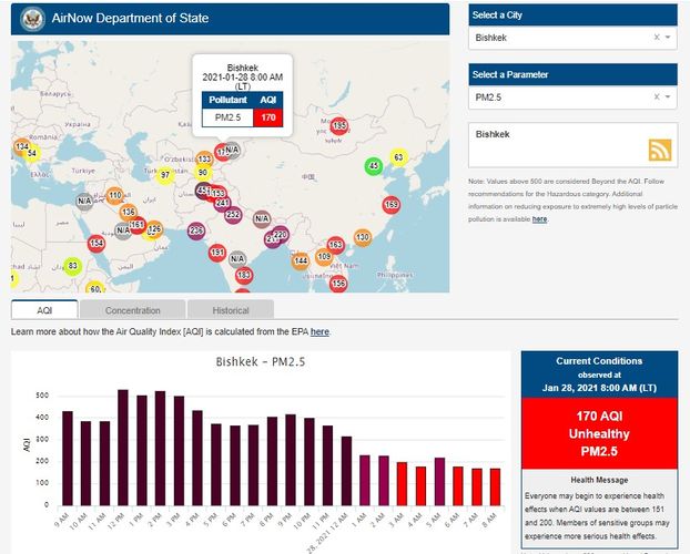 Информация обновляется каждый час. На 8.00 индекс качества воздуха в районе дипломатической миссии — 170 (AQI).