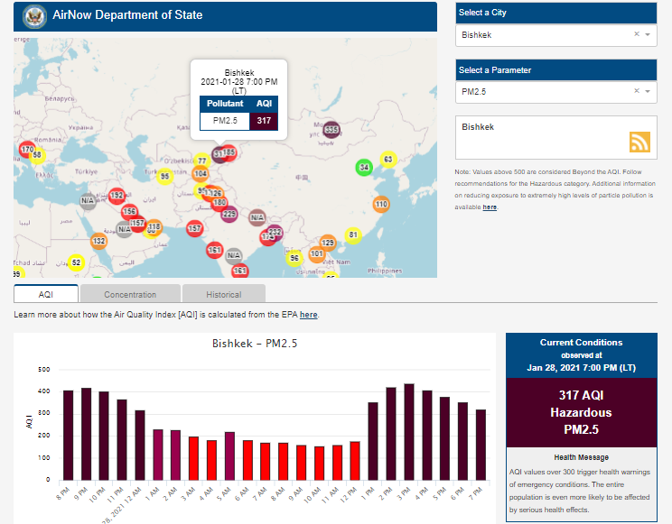 Информация обновляется каждый час. На 19.00 индекс качества воздуха в районе дипломатической миссии — 371 (AQI).