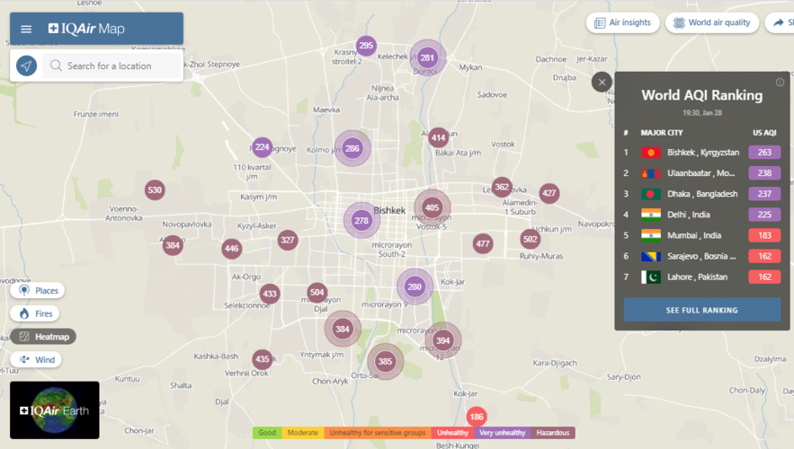В рейтинге крупнейших городов мира по качеству воздуха World Air Quality Бишкек находится на первом месте.