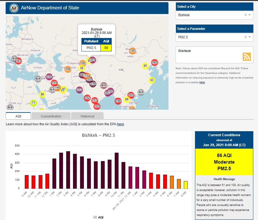 Посольство США в Кыргызстане также установило датчик. Информация обновляется каждый час. На 8.00 индекс качества воздуха в районе дипломатической миссии — 86 (AQI).