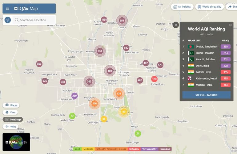 В рейтинге крупнейших городов мира по качеству воздуха World Air Quality Бишкек опустился на восьмое место.