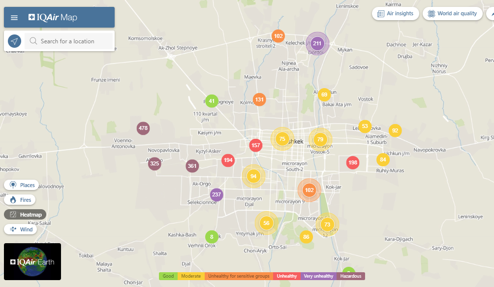 Общественный фонд «Институт экологических решений» установил датчики в столице и пригороде. На карте можно увидеть среднее значение AQI в разных районах Бишкека. Его обновляют ежечасно.