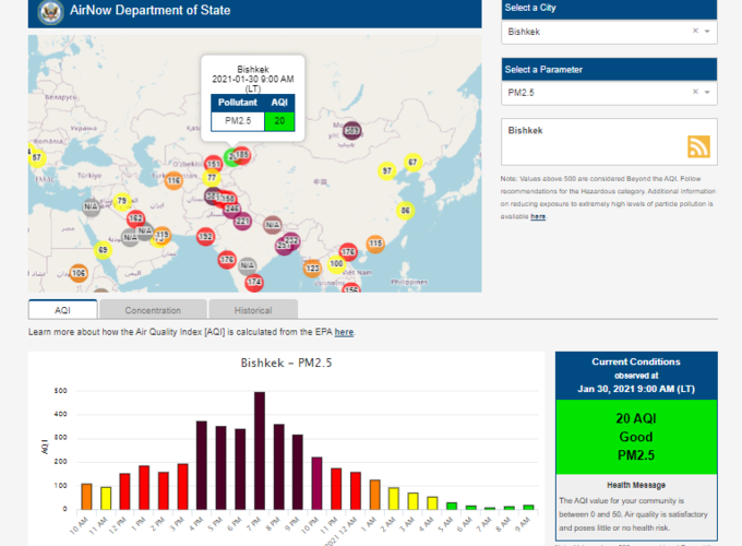 Посольство США в Кыргызстане также установило датчик. Информация обновляется каждый час. На 9.00 индекс качества воздуха в районе дипломатической миссии — 20 (AQI).
