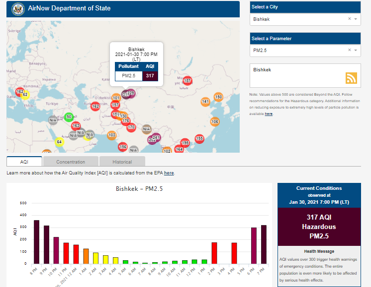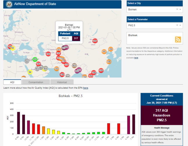 Посольство США в Кыргызстане также установило датчик. Информация обновляется каждый час. На 19.00 индекс качества воздуха в районе дипломатической миссии — 317 (AQI).