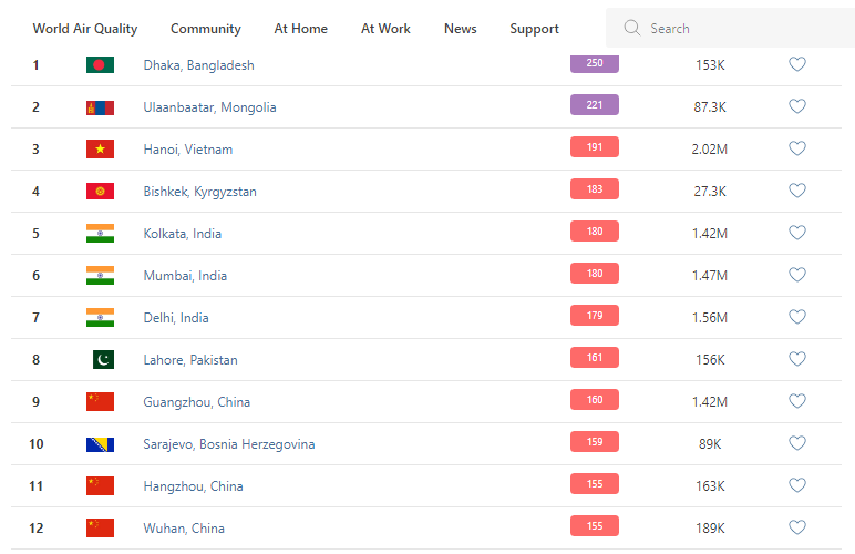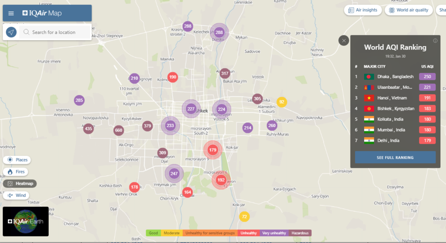 В рейтинге крупнейших городов мира по качеству воздуха World Air Quality Бишкек поднялся на 4-е место.