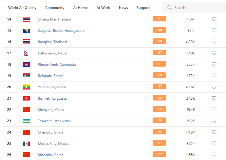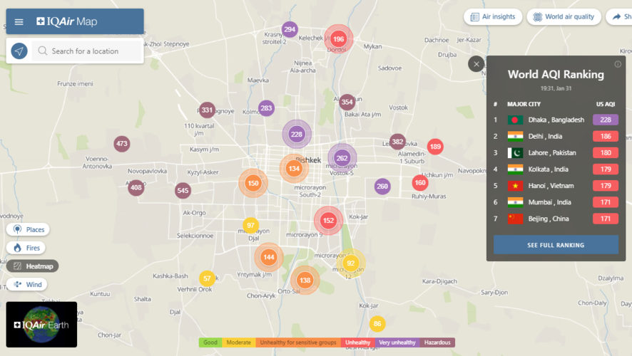В рейтинге крупнейших городов мира по качеству воздуха World Air Quality Бишкек поднялся на 21-е место.
