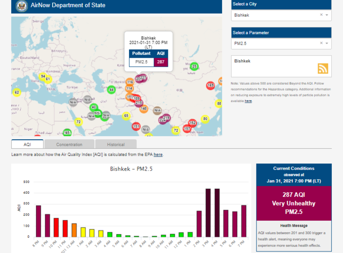 Посольство США в Кыргызстане также установило датчик. Информация обновляется каждый час. На 19.00 индекс качества воздуха в районе дипломатической миссии — 287 (AQI).