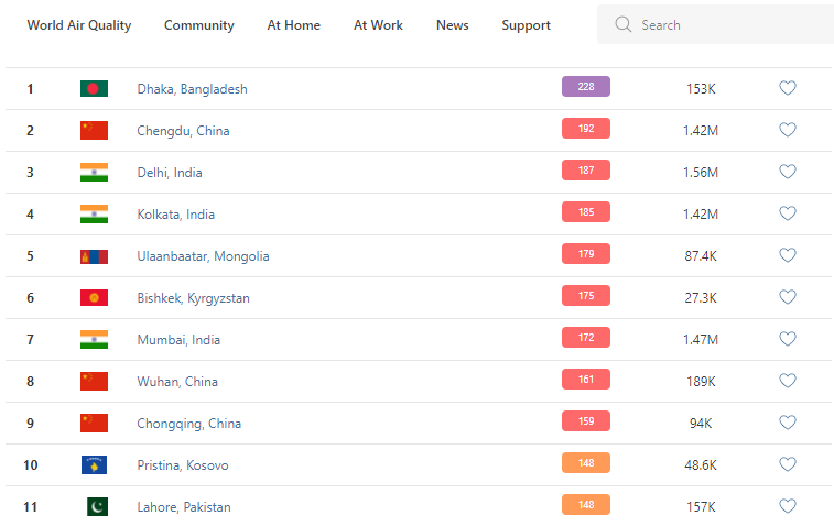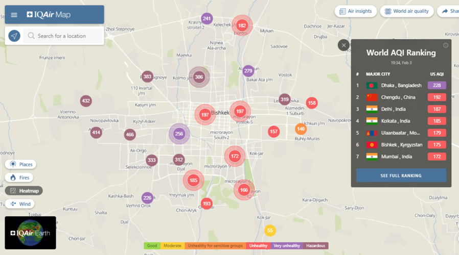 В рейтинге крупнейших городов мира по качеству воздуха World Air Quality Бишкек поднялся на 6-е место.