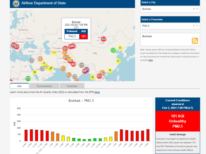 Посольство США в Кыргызстане также установило датчик. Информация обновляется каждый час. На 19.00 индекс качества воздуха в районе дипломатической миссии — 181 (AQI).