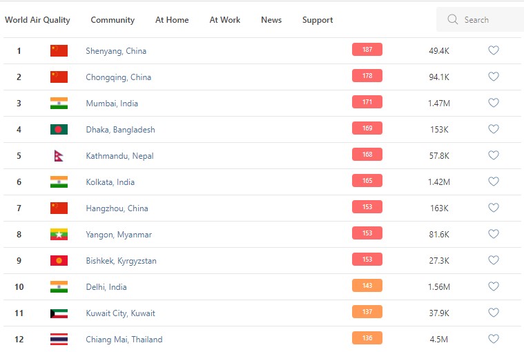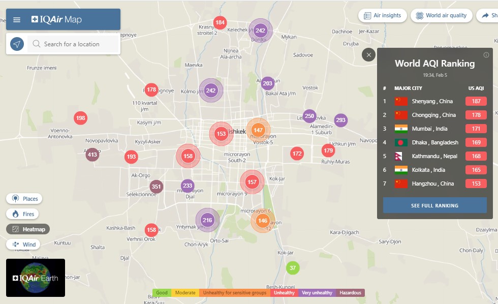 В рейтинге крупнейших городов мира по качеству воздуха World Air Quality Бишкек поднялся на 9-е место.