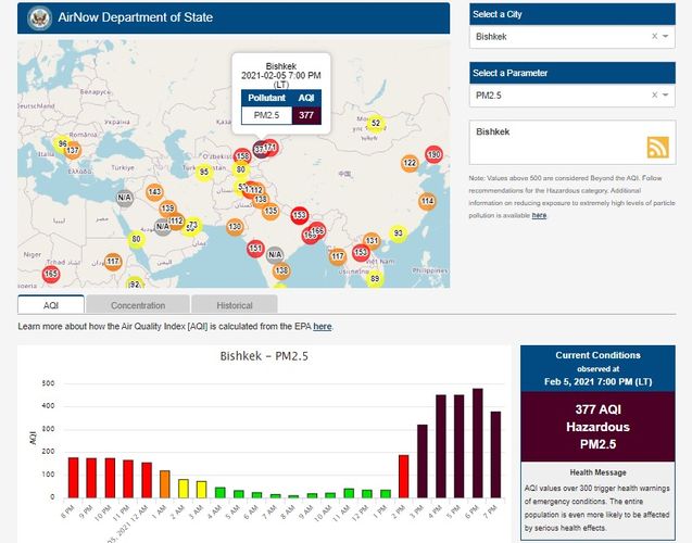 Посольство США в Кыргызстане также установило датчик. Информация обновляется каждый час. На 19.00 индекс качества воздуха в районе дипломатической миссии — 377 (AQI).