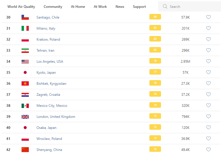 В рейтинге крупнейших городов мира по качеству воздуха World Air Quality Бишкек опустился на 36-е место.