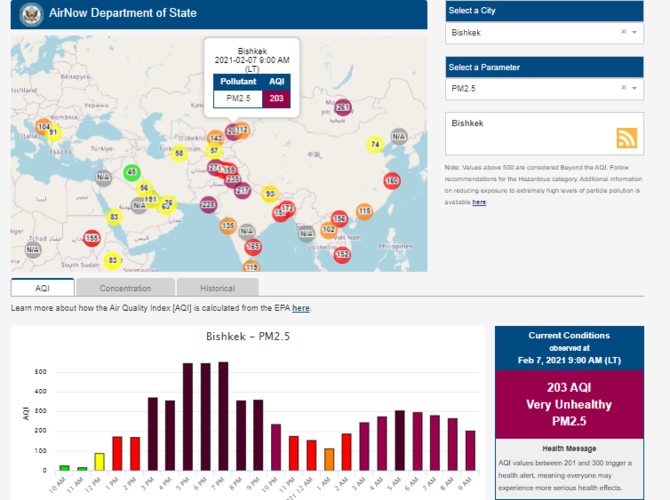 Посольство США в Кыргызстане также установило датчик. Информация обновляется каждый час. На 9.00 индекс качества воздуха в районе дипломатической миссии — 203 (AQI).