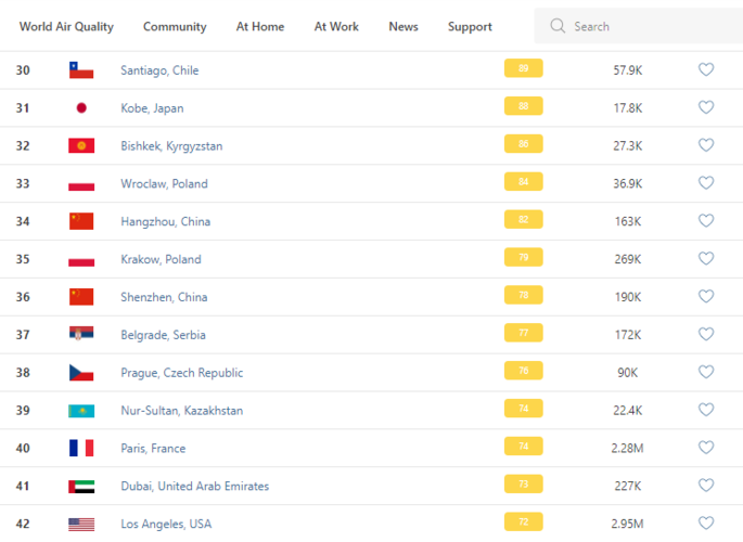 В рейтинге крупнейших городов мира по качеству воздуха World Air Quality Бишкек поднялся на 32-е место.