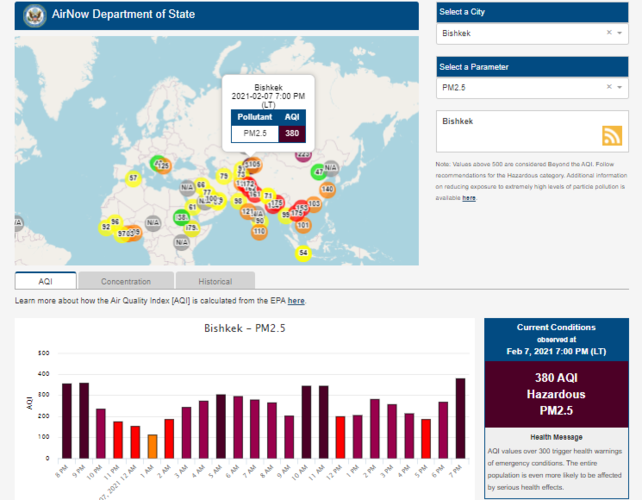 Посольство США в Кыргызстане также установило датчик. Информация обновляется каждый час. На 19.00 индекс качества воздуха в районе дипломатической миссии — 380 (AQI).