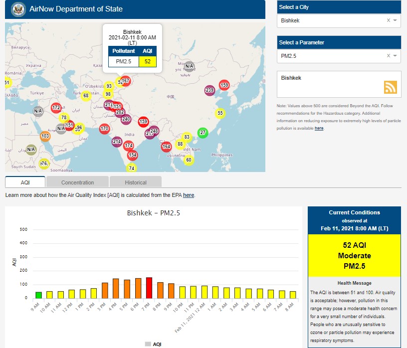 Посольство США в Кыргызстане также установило датчик. Информация обновляется каждый час. На 8.00 индекс качества воздуха в районе дипломатической миссии — 52 (AQI).