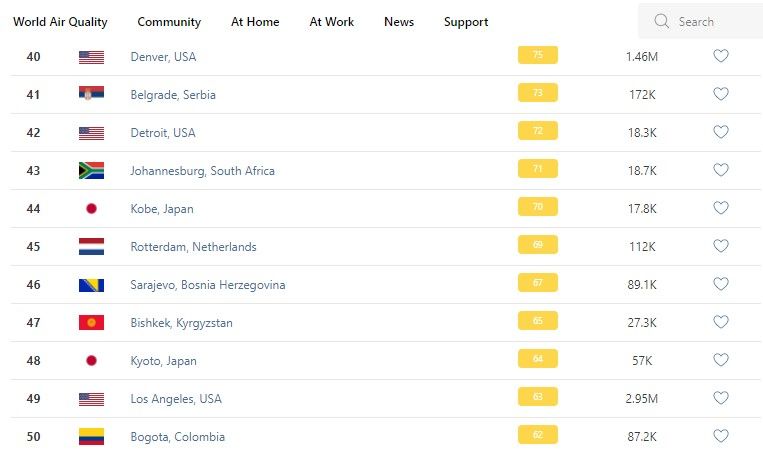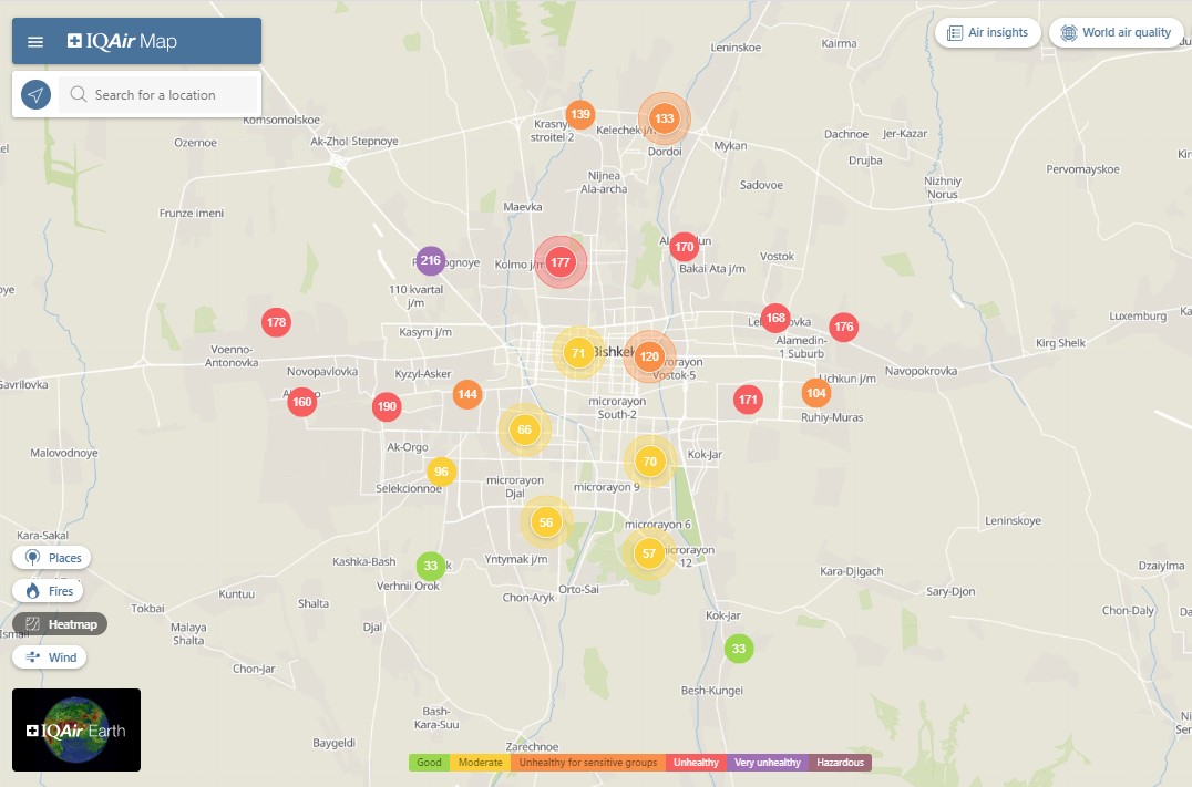 В рейтинге крупнейших городов мира по качеству воздуха World Air Quality Бишкек опустился на 47-е место.