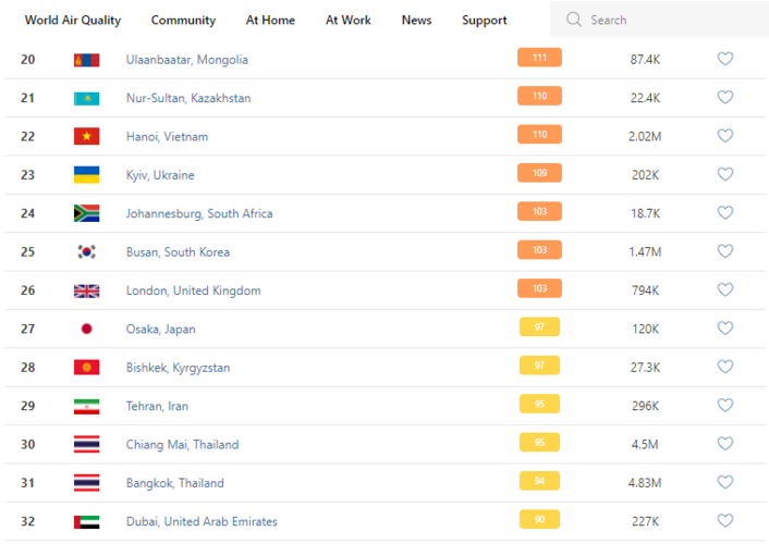 В рейтинге крупнейших городов мира по качеству воздуха World Air Quality Бишкек поднялся на 28-е место.