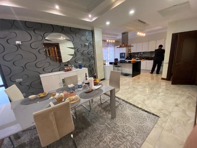 Интерьер приемной-столовой комнаты в доме директора департамента дорожного хозяйства при Минтрансе Шабданбека Иманкулова изобилует лепниной, она имеет место быть. Мебель неплохая, портьеры алого цвета в этническом стиле — не лучшая компания барочному стилю интерьера и очень спорны в контексте конкретной комнаты.