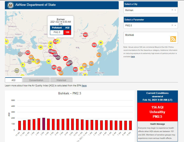 Посольство США в Кыргызстане также установило датчик. Информация обновляется каждый час. На 9.00 индекс качества воздуха в районе дипломатической миссии — 156 (AQI).