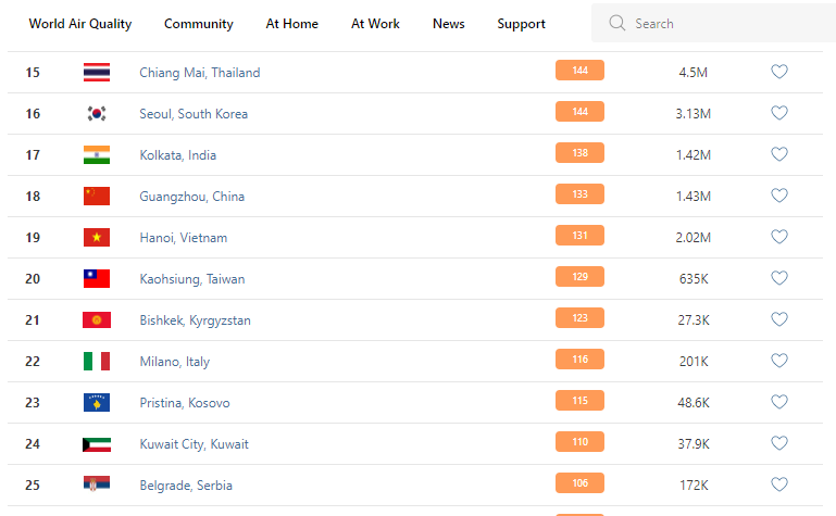 В рейтинге крупнейших городов мира по качеству воздуха World Air Quality Бишкек опустился на 21-е место.