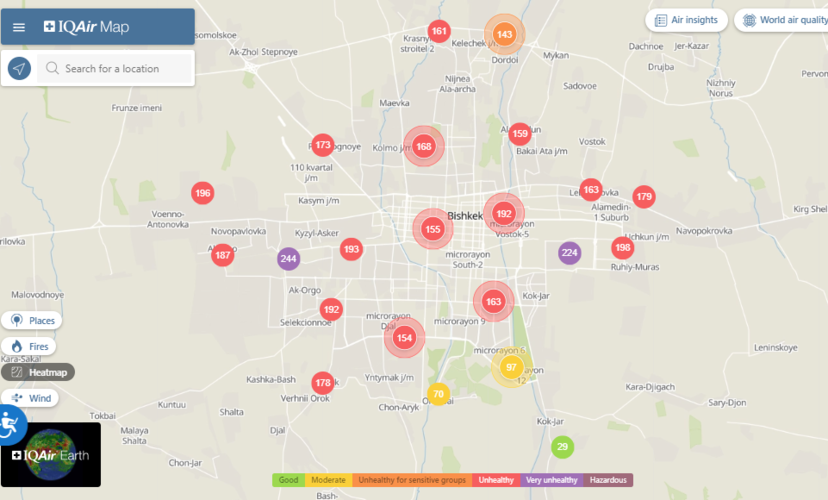 Общественный фонд «Институт экологических решений» установил датчики в столице и пригороде. На карте можно увидеть среднее значение AQI в разных районах Бишкека. Его обновляют ежечасно.