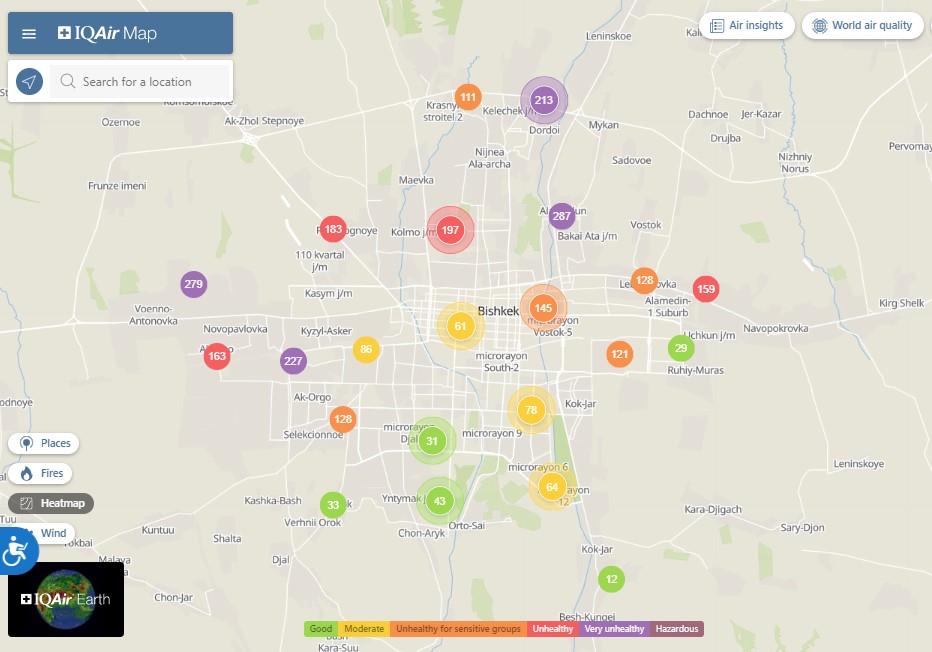 Общественный фонд «Институт экологических решений» установил датчики в столице и пригороде. На карте можно увидеть среднее значение AQI в разных районах Бишкека. Его обновляют ежечасно.