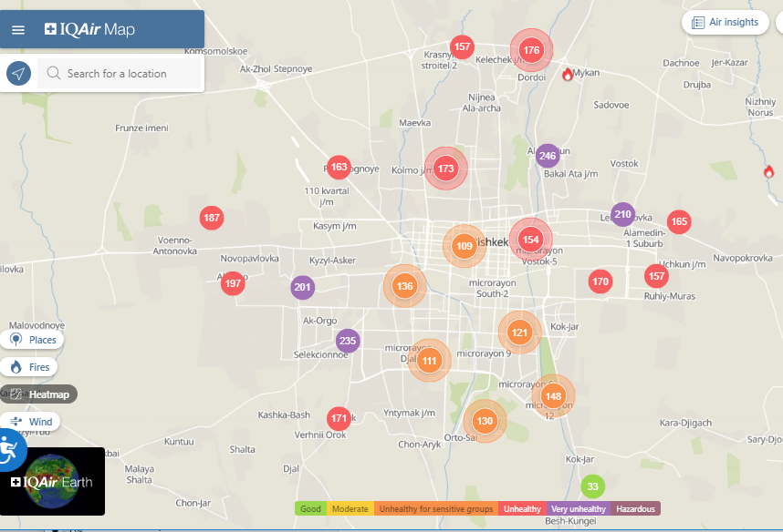 Общественный фонд «Институт экологических решений» установил датчики в столице и пригороде. На карте можно увидеть среднее значение AQI в разных районах Бишкека. Его обновляют ежечасно.