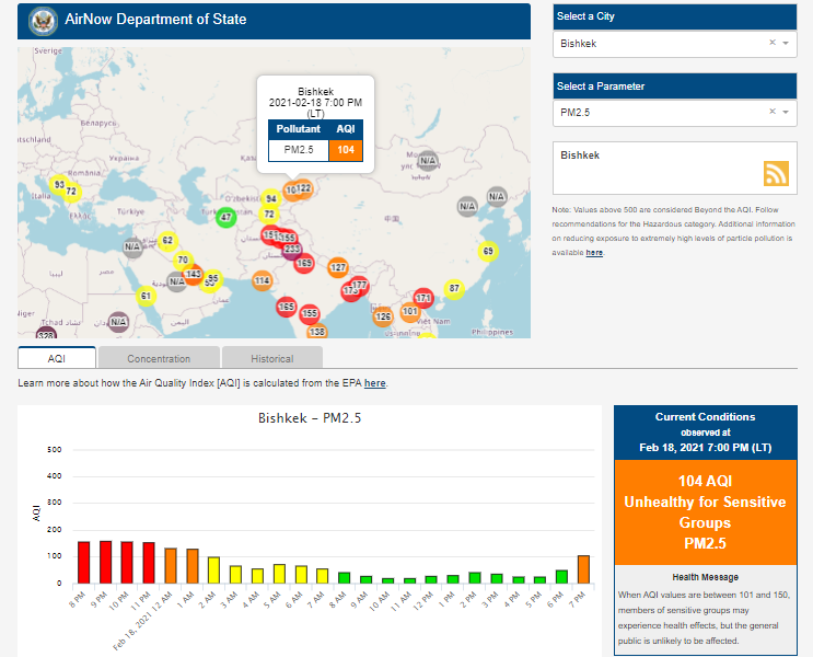 Посольство США в Кыргызстане также установило датчик. Информация обновляется каждый час. На 19.00 индекс качества воздуха в районе дипломатической миссии — 104 (AQI).