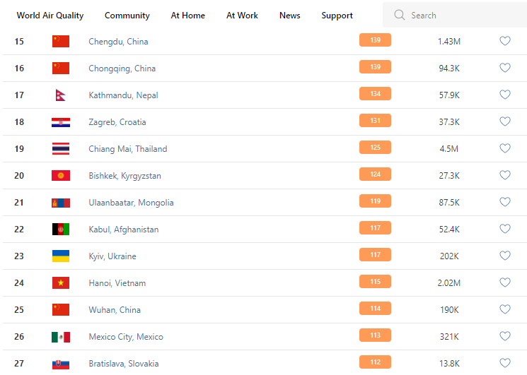 В рейтинге крупнейших городов мира по качеству воздуха World Air Quality Бишкек находится на 20-м месте.