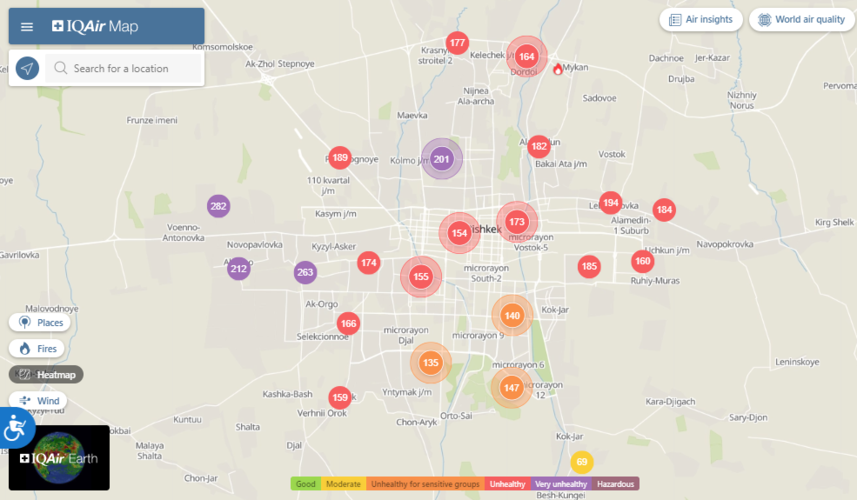 Общественный фонд «Институт экологических решений» установил датчики в столице и пригороде. На карте можно увидеть среднее значение AQI в разных районах Бишкека. Его обновляют ежечасно.