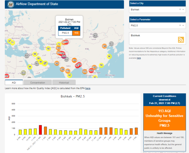 Посольство США в Кыргызстане также установило датчик. Информация обновляется каждый час. На 19.00 индекс качества воздуха в районе дипломатической миссии — 113 (AQI).