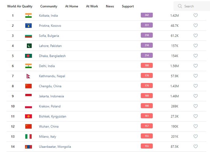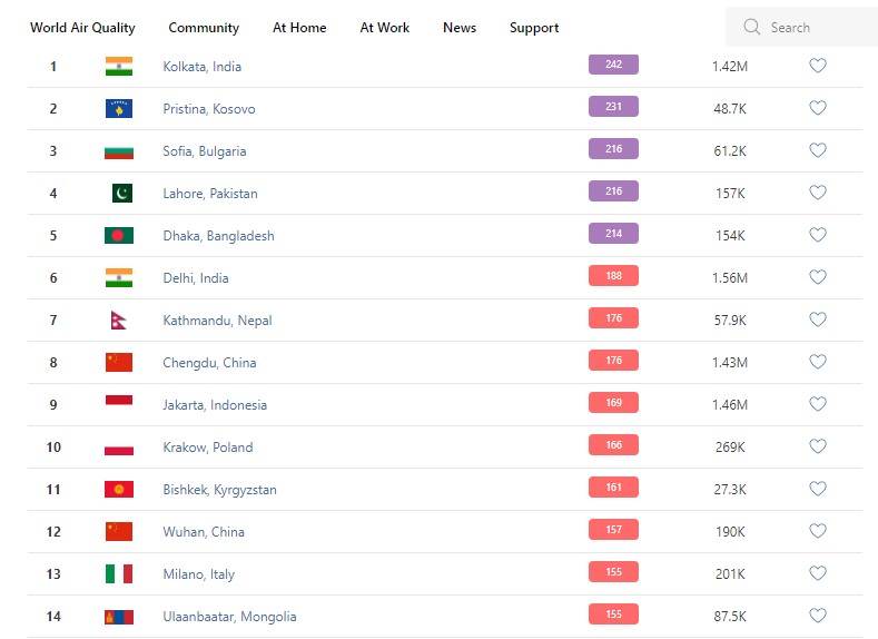 В рейтинге крупнейших городов мира по качеству воздуха World Air Quality Бишкек поднялся на 11-е место.