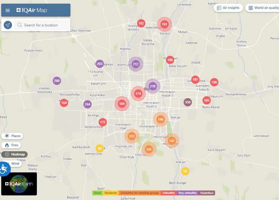 Общественный фонд «Институт экологических решений» установил датчики в столице и пригороде. На карте можно увидеть среднее значение AQI в разных районах Бишкека. Его обновляют ежечасно.