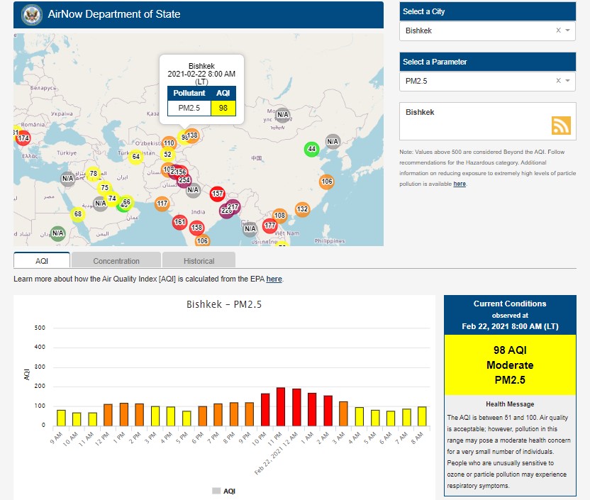 Посольство США в Кыргызстане также установило датчик. Информация обновляется каждый час. На 8.00 индекс качества воздуха в районе дипломатической миссии — 98 (AQI).