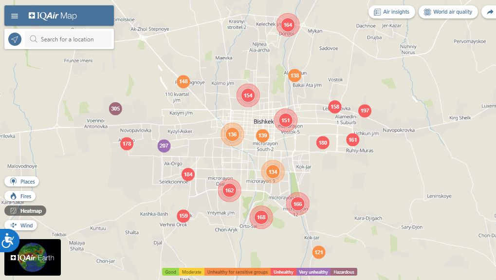 Общественный фонд «Институт экологических решений» установил датчики в столице и пригороде. На карте можно увидеть среднее значение AQI в разных районах Бишкека. Его обновляют ежечасно.