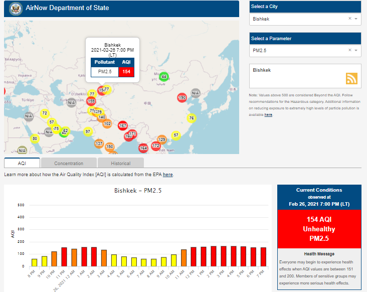 Посольство США в Кыргызстане также установило датчик. Информация обновляется каждый час. На 19.00 индекс качества воздуха в районе дипломатической миссии — 154 (AQI).